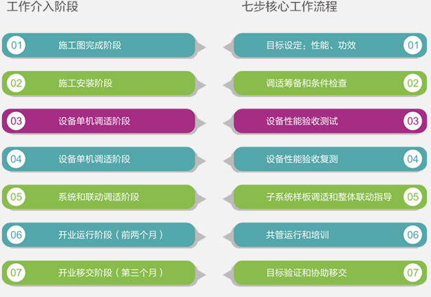提出目标导向的七步核心调适工作流程,有效保障机电系统调适工作,在此基础上,为不同需求客户提供组合式服务,如空调系统全流程调适、设备能效验收与调适、机电系统承接查验等等专项服务。