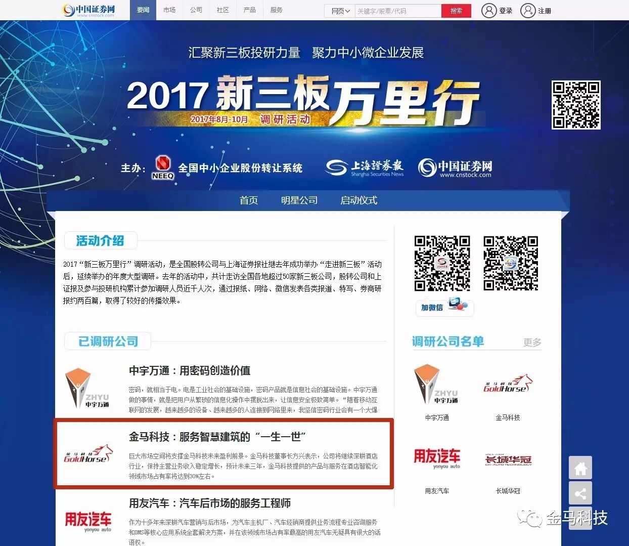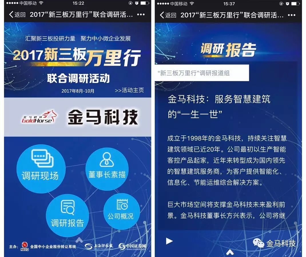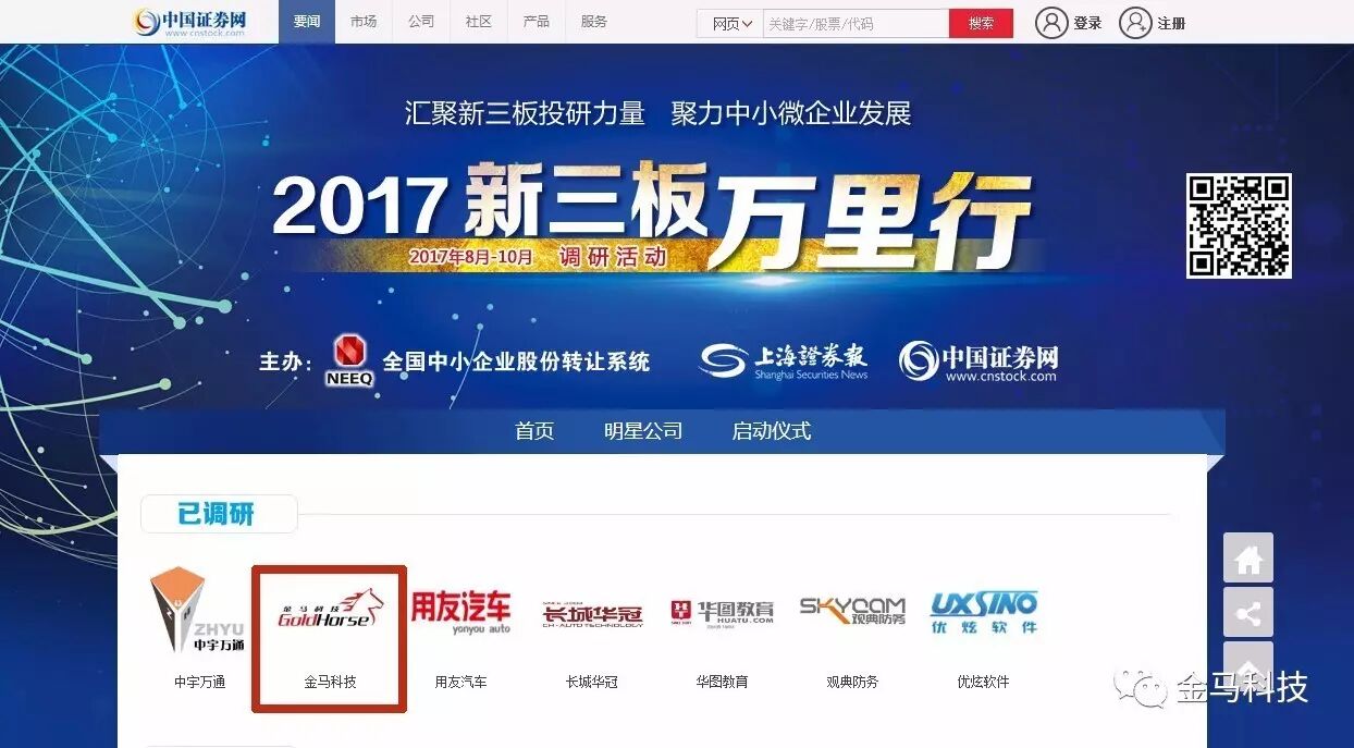 8月17日,由全国中小企业股份转让系统、上海证券报、中国证券网联合主办的“2017新三板万里行”联合调研活动对金马科技进行了考察调研,金马科技以高品质自主研发产品、丰富的系统集成经验、一流的专家服务团队、大量的高端项目案例,受到调研组的一致认可,活动结束后,金马科技被评为明星企业,并在中国证券网、上海证券报官网进行专题报道。