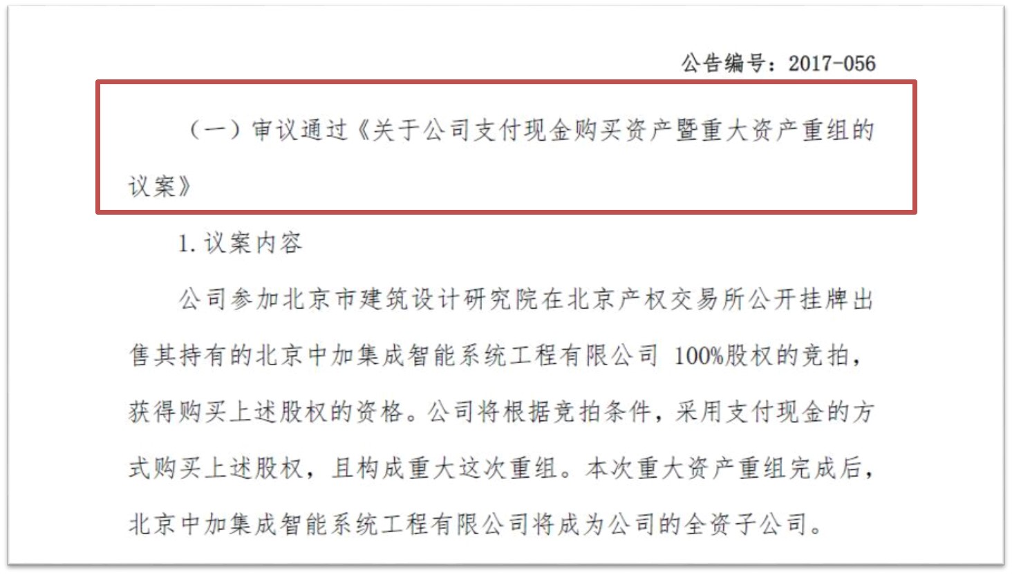 11月10日,金马科技股东大会已正式审议通过《关于公司支付现金购买资产暨重大资产重组的议案》并在股转系统正式披露,意味着股权转让方北京市建筑设计研究院和受让方金马科技就北京中加集成智能系统工程有限公司(下文称中加集成)的股权交割进入实质阶段。