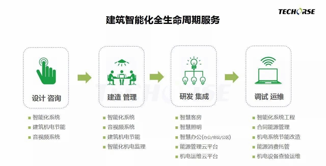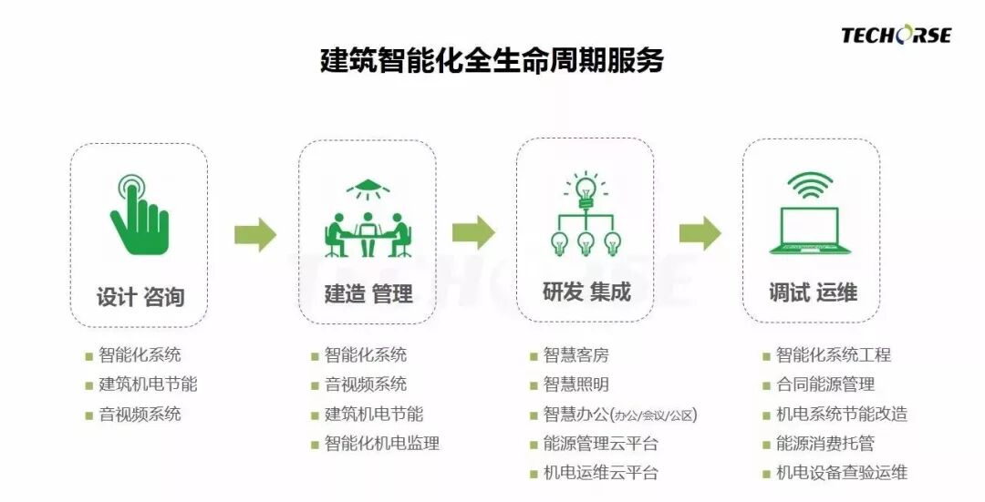 升级的不止是Logo,更是业务形态和服务模式。金马科技把握行业发展趋势,锐意产业布局,于2017年成功收购智能化领域知名国企——中加集成(全称:北京中加集成智能系统工程有限公司,详见延伸阅读),补齐了公司在建筑设计、施工管理方面的短板,形成从建筑前期规划设计、中期施工管理、到后期运营维护的全生命周期一站式服务体系,为客户打造更高品质、更短工期、更低成本的智能化建筑,创建便捷高效、健康舒适、节能环保的智慧生活空间。