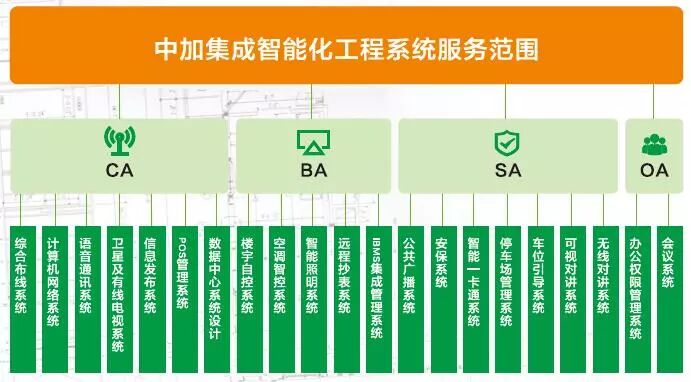 智者结伴而行,中加集成(北京中加集成智能系统工程有限公司)以专业的设计施工能力和出色的技术积淀,为项目提供包括楼宇自控系统、安防系统、信息网络系统、电子巡更系统、车位引导、访客管理系统在内的多个智能化系统,并结合项目定位,提出降耗增效针对性解决方案:
