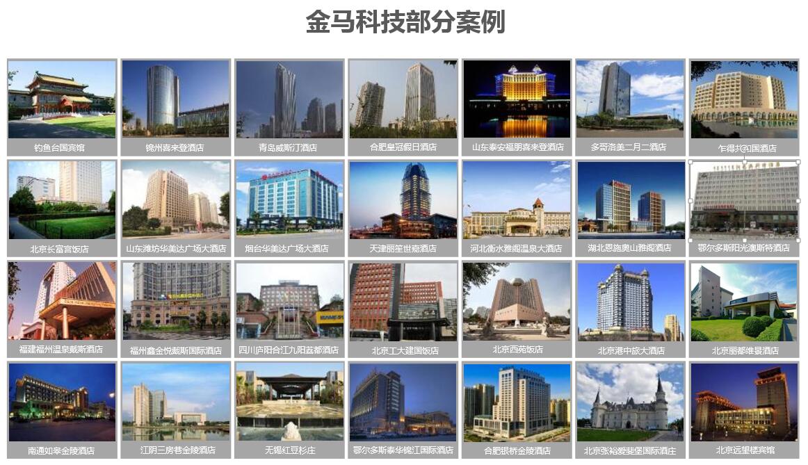 金马科技成立于1998年,专注智慧建筑20年,坚持以“为客户提供最可靠、最经济、最人性化的服务与产品”为发展动力,聚焦客户压力与痛点,持续加大研发投入,以工匠之心,不断打磨系统产品、创新服务模式。到目前为止,金马科技已服务五星级以上项目超过2000个、客房数量超200000间,不仅服务于喜达屋、温德姆、洲际、雅阁、金陵、港中旅等知名酒管集团旗下的地标性酒店,还服务于钓鱼台国宾馆、全国人大会议中心、石油科技国际研发中心等重要军政工程。
