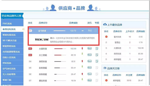 金马科技在迈点客房控制系统品牌指数排行榜名列前茅
