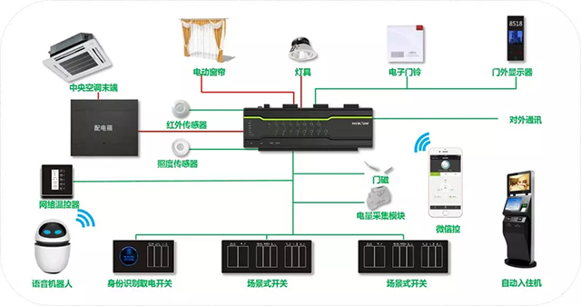 通过采集、分析客房设备用电情况,并针对通风空调、照明等耗能大户进行参数预设、节能控制,节能环保。