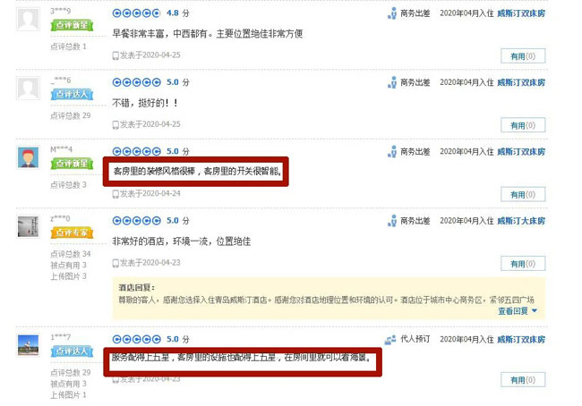 酒店的携程评分是4.6分,地理位置非常优越,进入酒店,映入眼帘的便是可以自己办理入住的智能前台;房间里的设备也融入了很多智能化元素;酒店一大特色便是:在客房内就可以俯瞰海滨美景;干净、服务品质好、客房比较智能是携程用户评价最多的。