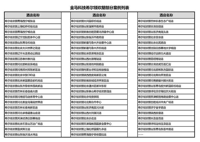 目前,金马科技服务的希尔顿欢朋项目已有近80家开业上线,其中不乏上海虹桥机场希尔顿欢朋酒店、北京国贸商务区希尔顿欢朋酒店、北京新国展希尔顿欢朋酒店、泰安泰山景区希尔顿欢朋酒店、西宁昆仑希尔顿欢朋酒店、乌鲁木齐国际机场希尔顿欢朋酒店等交通枢纽、商务中心、著名景区配套酒店。未来,金马科技将持续研发创新,为希尔顿欢朋提供更好的产品与服务,一路携手,共赢未来。