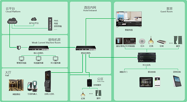 金马科技紧跟科技发展步伐,运用人工智能、物联网、大数据等新兴技术,结合自身研发优势,采用基于云平台的智慧酒店新一代解决方案与该酒店携手合作,为其提供包括语音智控、智能灯光、背景音乐、智能场景、智能服务、环境控制等服务。